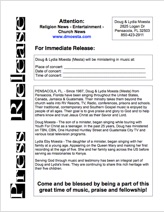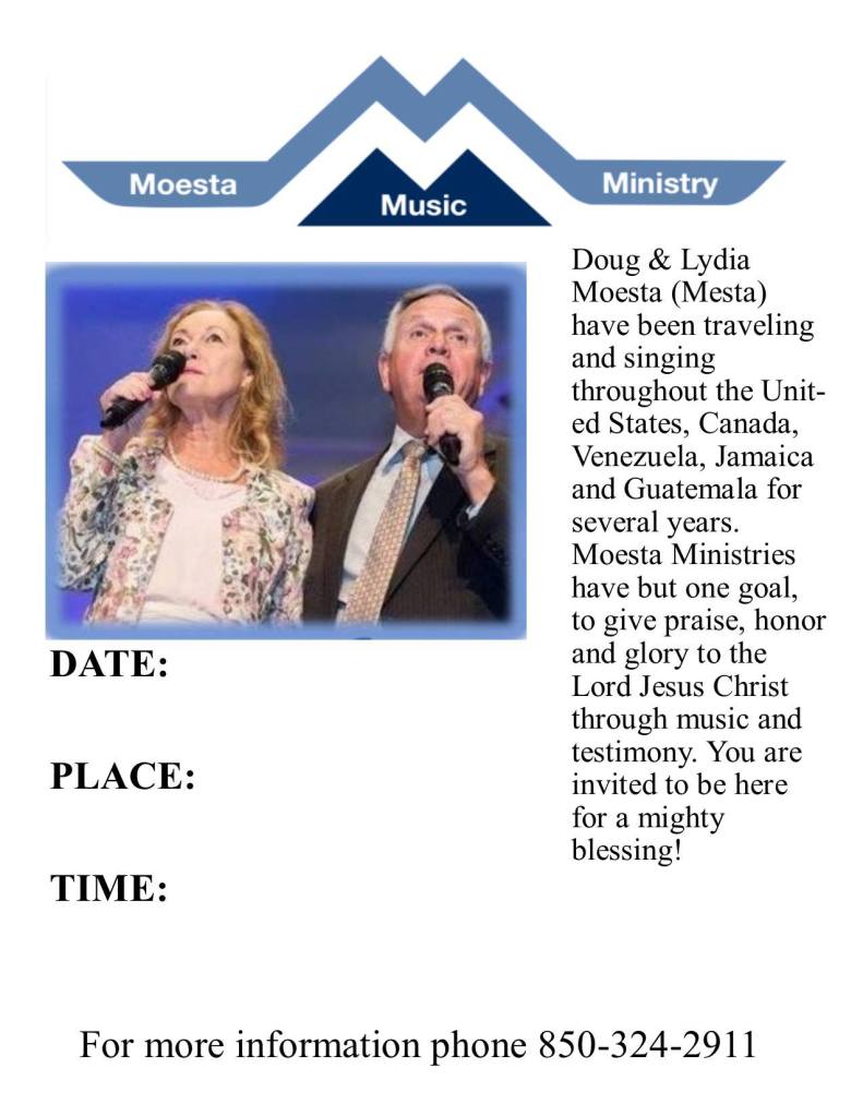 We bring our own accommodations. Our Motorhome is an integral part of our ministry as our ministry takes us beyond the church walls into RV Resorts, TV, Radio, conferences, prisons and schools. Our traditional, contemporary and Southern Gospel music is enjoyed by people of all ages. Our goal is to give praise and glory to God and to help others know and trust Jesus Christ as their Savior and Lord.